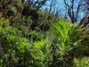 Poodle dog bush grows in density in relation to fire intensity. Where mild to moderate burning occurred, there is little or no poodle dog bush. Where the fire was hottest, exhibiting extreme fire behavior and consuming trees completely, poodle dog grows dense.