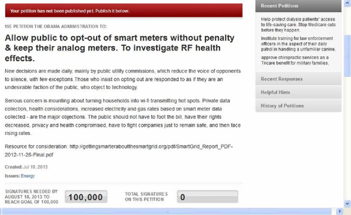 This National Smart Meter Petition needs 100,000 signatures by August 18th, 2013 in order to get response from the Obama Administration.