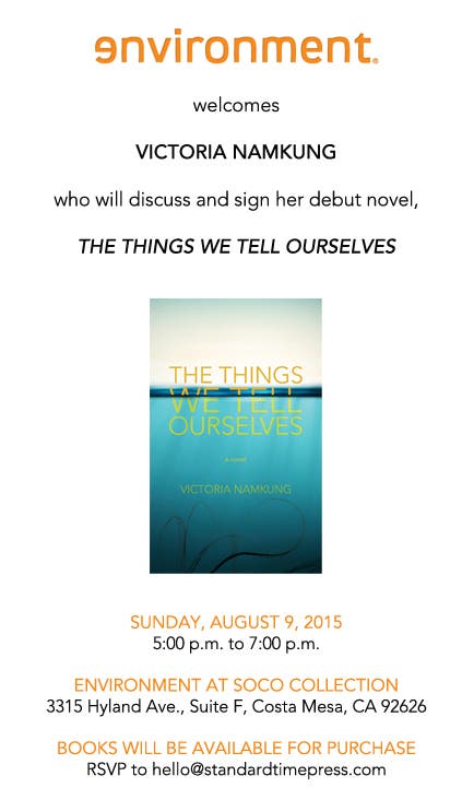 Join us as renowned author Victoria Namkung discusses her first novel, The Things We Tell Ourselves, at Environment at SOCO in Costa Mesa on Sunday, August 9, 2015 from 5-7 pm. Her debut novel will focus on the damage that one generation can inflict on the next and the things we tell ourselves to justify our desires and compromises.