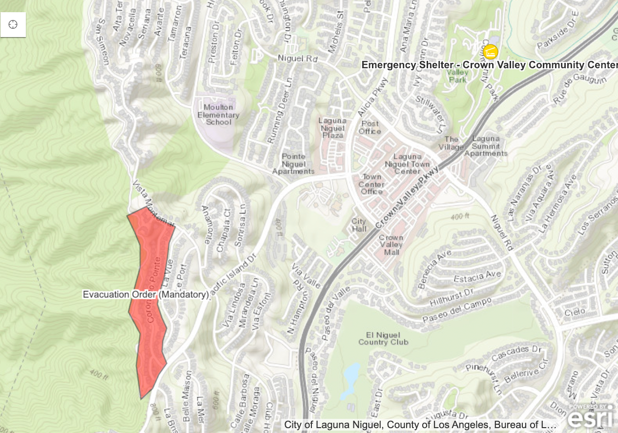 The evacuation order impacts Laguna Niguel communities in Coronado Pointe Drive, Vista Court and Via La Rosa in the Pacific Island area of the city, according to the Orange County Sheriff's Department.