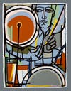 The man behind the kit in Drummer just slammed the ride cymbal, which is shown pulsating perpendicular to the ground, ringing with a see-through halo around its edges, exaggerating its vibration. But you can tell in the drummer’s eyes where his focus lies, not in the blaring crash, but rather in the continuing groove—left hand on the hi-hat—repositioning the drum stick in his right hand, perhaps locking eyes with another musician, awaiting a musical cue from his bassist?