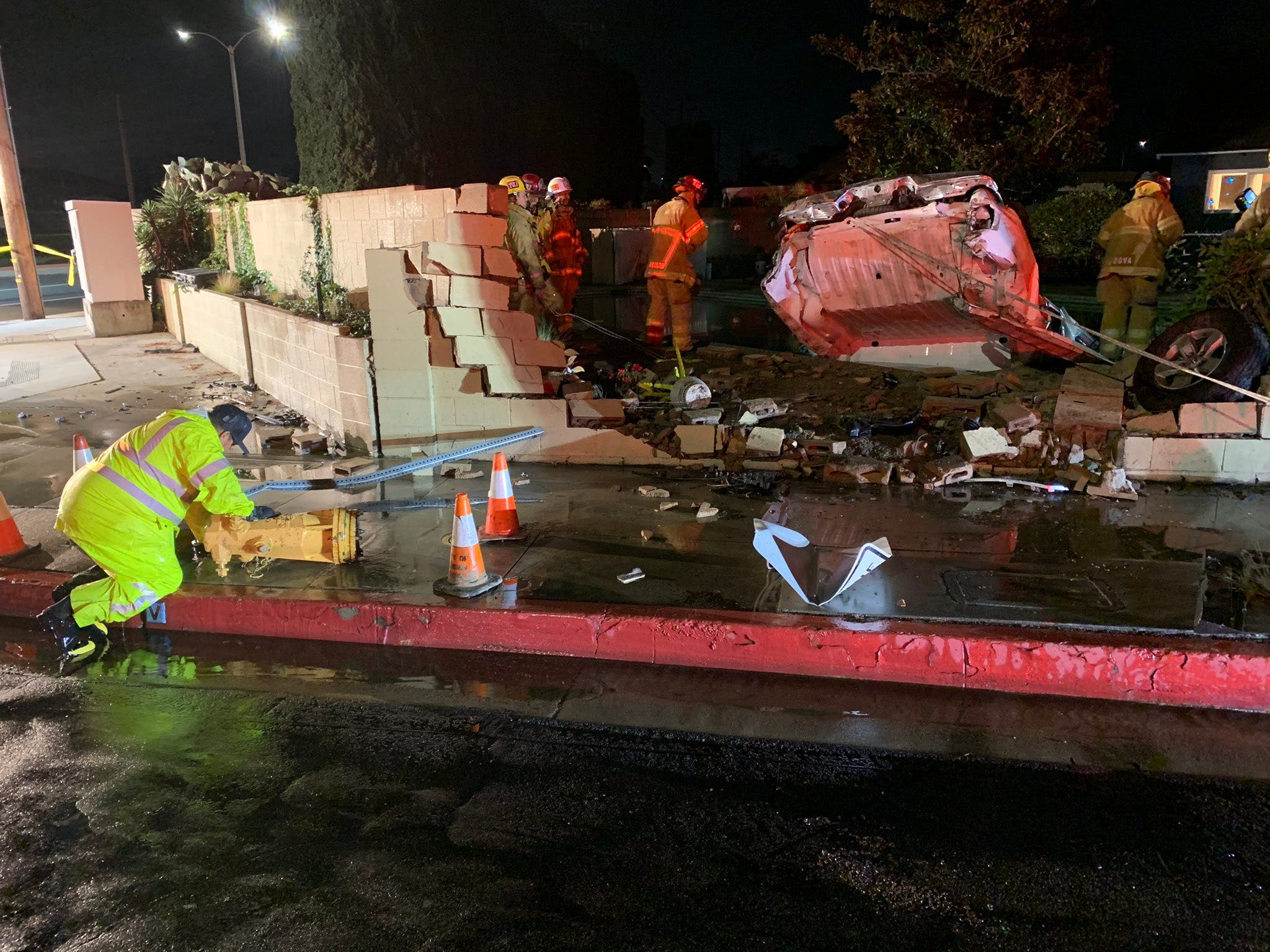 Orange County Fire Authority and police responded to the scene where a Dodge Ram Pickup slammed into a car, a hydrant, block wall and pool.