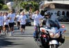 Surrounded by a motorcade that included a fire truck, a police truck and two motorcycles, the joggers began their 5.5 mile run north on Coast Highway to the intersection of Newport Coast, where they would hand the torch off to the Newport Beach runners.