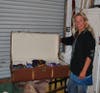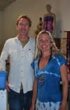Chris Boucher, Laguna Beach resident and owner of Hempsteads International, is on hand delivering fabric to Hutchinson in her studio. He supplies Hutchinson with material for her creations.