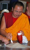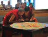 On Sunday morning, about 50 visitors at the Neighborhood Congregational Church watched as visiting monks from India's Drepung Loseling monastery placed the finishing touches on a brightly-colored three-foot mandala made of sand. It took the men five days to create the design, which was filled with Buddhist symbolism.