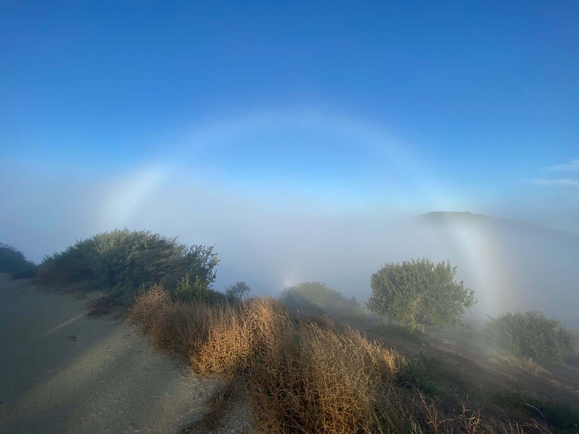 LAGUNA BEACH, CA — Orange County resident Deb Franko captured this rare sight on Monday during her Aliso Trails walk. A fog rainbow sometimes referred to as a "ghost rainbow," is a rare sight.