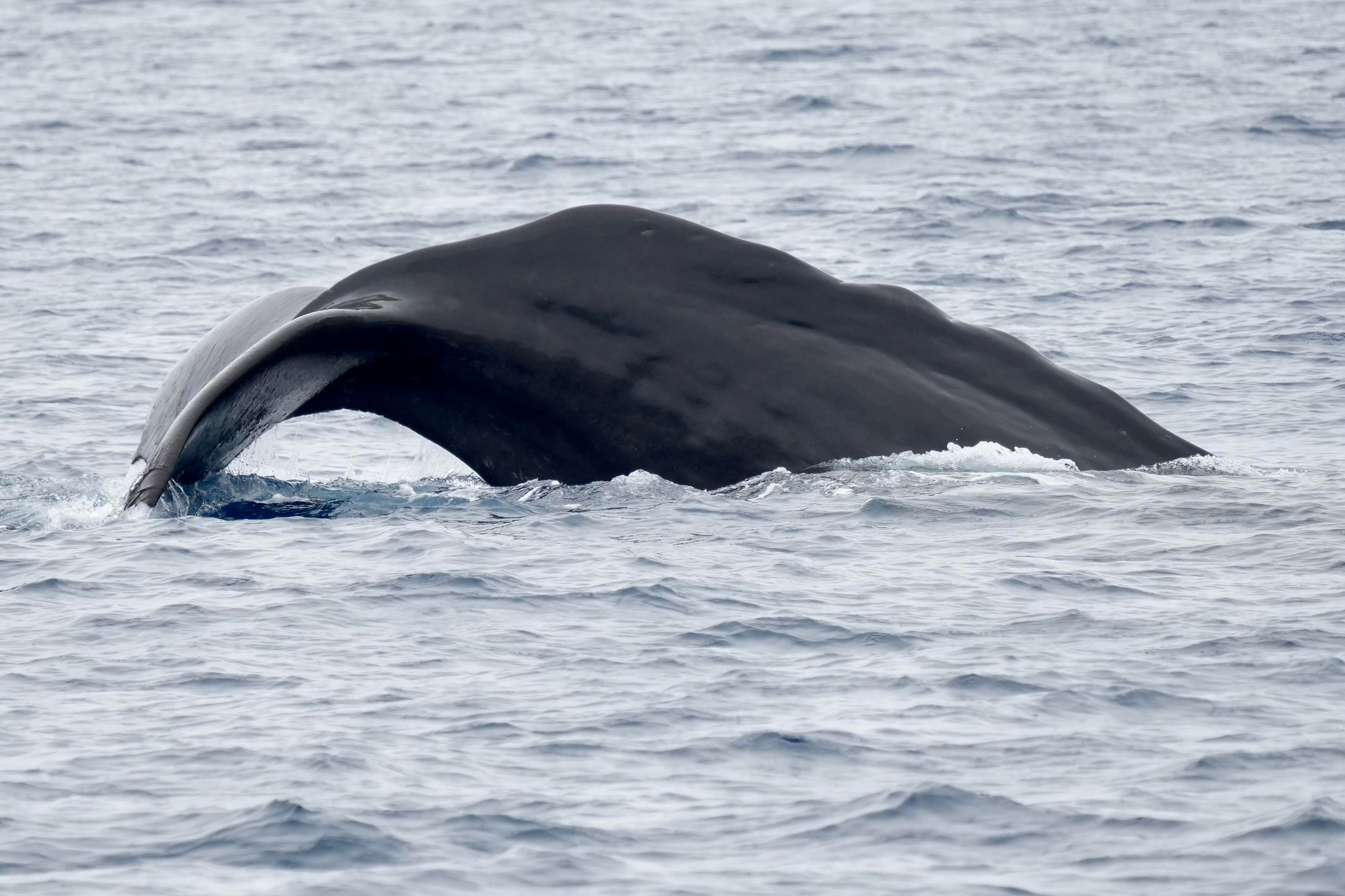 "We were able to watch an entire breathing cycle that lasted over six minutes," said Nona Reimer of Dana Wharf Sportfishing and Whale Watching. "Then, the largest of the toothed whales made its terminal dive sending its flukes straight up in the air."