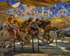 The Ride with a Snap, Venice, California (1918) was painted during the final year of WWI, the same year Karl Yens helped to found the Laguna Beach Art Association. Born in Germany, he immigrated to the United States around the turn of the twentieth century. In Yens’ bold and decorative style, Ride with a Snap evokes distant memories of childhood innocence. Smiling children ride on a merry-go-round, grasping the harnesses of faux horses that are frozen in mid-gallop with crazed, wild-eyed shouts of pain in their high-gloss expressions.