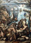Like Yens and de Erdely, Phil Dike (1906-1990) was a member of the California Water Color Society. A prominent California regionalist in the 1930s and 1940s, he also worked as a color coordinator and story designer on animated classics like Snow White and Fantasia. Dike left Disney in 1945 and returned to painting and teaching full time. Then came Fisherman’s Rocks (1947), which marked a moment of post-WWII transformation, bridging elements of classic and abstract seascapes. In Rocks, ships are sailing out to sea from Corona del Mar (where Dike and Rex Brandt formed the Brandt-Dike Summer School of Painting that same year). The horizon is slightly arched, high on the canvas, and feels as distant as ever. Yet the rocks on the coast are constructed out of rectangle splinters and earth-tone splatters, suggestive of an intrinsic explosive potential within matter itself (i.e, nuclear fission), while reinforcing fundamental tensions between life on land and life at sea. By the 1960s, Dike’s work would reach near total abstraction.