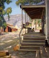 Self-taught artist Edgar Payne was the first president of the association, having visited Laguna Beach in 1911. His oeuvre includes the desert Southwest, French and Italian harbor scenes, the Alps, and the High Sierra, such as the featured Sierra Packer (1939). In 1917, Payne returned to Laguna Beach with his wife, Elsie Payne—Elsie’s A Decent Burial (1942) is also on display, the only watercolor in Landscapes—and their daughter. Kleitsch followed in Paynes’ lead, moving to L.B. in 1920, where he vowed to portray the town in multiple paintings before the onslaught of inevitable real estate development. The Old Post Office (1922-1923) depicts, in bold colors and bravura brushwork, the charming beach town’s General Store on a bright afternoon, where residents used to receive their mail. Here, a dog sits up on the steps, an empty wooden crate waits in the road, and a structureless bluff in the background stands blanketed in chaparral.