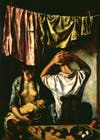 Francis de Erdely (1904-1959) grew up in Hungary during the first World War. His sketches and early paintings of the devastation got him banished from his home country by the Gestapo, and so in the 1930s he fled the rise of fascism to America. In Day’s End (1947), a young mother cradles her baby to sleep after feeding, her breasts illuminated in the day’s final hours. The father rests his head in his hands, looking down at his first born: an early Baby Boomer. He tries to ignore the dark, cramped living quarters, or perhaps he tries to repress memories from the war. Nonetheless, their dingy laundry is hanging to dry, and there are some vegetables on the table. Together, this nuclear family has made it through another day.