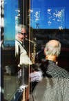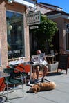 Just outside, Tom Cuccia reads his morning paper as his Golden Retriever, Cole, basks in the sun.