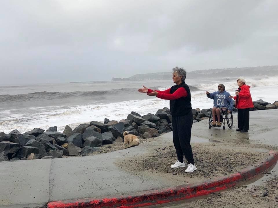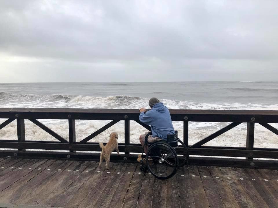 On Friday, they watched the surf from the remaining section of the boardwalk. There are only so many places that Babakanian can traverse from his chair.