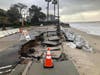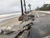 Further down the paved lot, orange pylons and caution tape are the only barriers between passers-by and the severe erosion that has eaten the shoreline by several feet. The famed Doheny palms list toward the shore even as the parking infrastructure continues to erode.