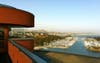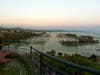 Diners enter on the highest level of the restaurant and then descend a spiral staircase down into the dining area. We were led into a circular dining room. There is kind of a space-age feeling to the décor. In the center of the ceiling is a circular wood sculpture, from which lighting is suspended. The wall facing the ocean is made almost entirely of windows, which allows every table an amazing view of the coastline and harbor. Around the room are booths, separated by concrete dividers. The tables are made of glossy wood.