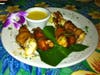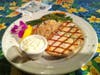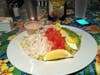 The patio is cozy with lots of heaters and outside lighting. It has a casual, cheerful, nautical ambiance with Hawaiian print vinyl tablecloths, bright blue umbrellas and plastic chairs. The patio is very close to the water and just across a walkway, there are boats docked, some decorated with lights. Our friendly waitress took our drink orders and seemed just as excited about the boat parade as we were. We ordered an appetizer to share. My husband chose the bacon wrapped jalapeno shrimp appetizer. This is something I would never have chosen, mostly because it is food wrapped in bacon, but it came beautifully presented on a banana leaf with an orchid blossom and was served with a lemony, slightly sweet sauce for dipping. The jalapeno kicked in after a bite or two, and the whole thing was really delicious.