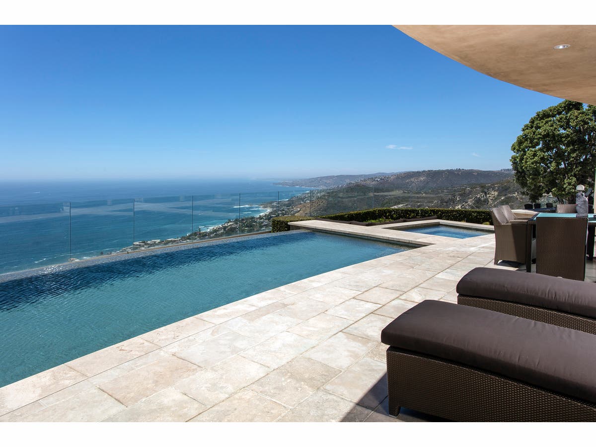 Boasting travertine floors throughout, the home has a media room, laundry room, paneled library or office, temperature-controlled wine cellar, a kitchen with a walk-in pantry and a great room with approximately 48 feet of sliding glass for indoor and outdoor living. The master bathroom has a master bathroom and walk-in closet. Other highlights include a three-car garage and a zoned air-conditioning and heating system. The backyard features a pool, spa, built-in BBQ, fire pit and fireplace with views of the coast and canyon.