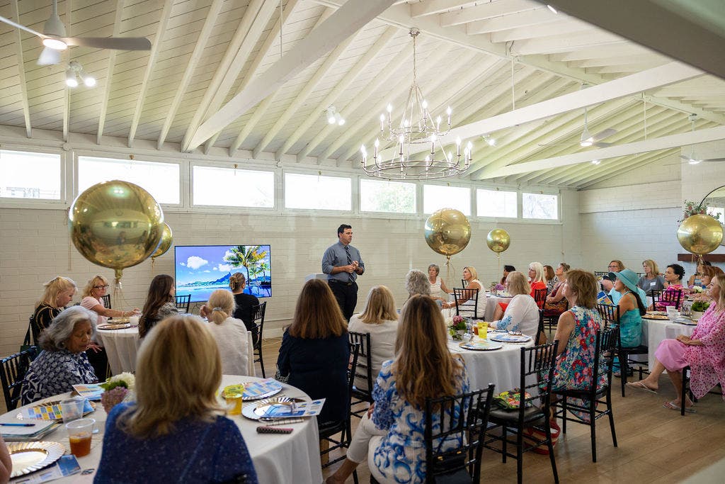Dana Point Women’s Club (DPWC) got its new fiscal year off to a roaring start with a very well attended September 5th meeting themed “Back to School, Back to Philanthropy”. The hospitality committee did a beautiful job decorating the Club-owned Community House with gold balloons and chargers, hot air balloon-themed florals and framed photos at each table depicting the Club’s many philanthropic programs.