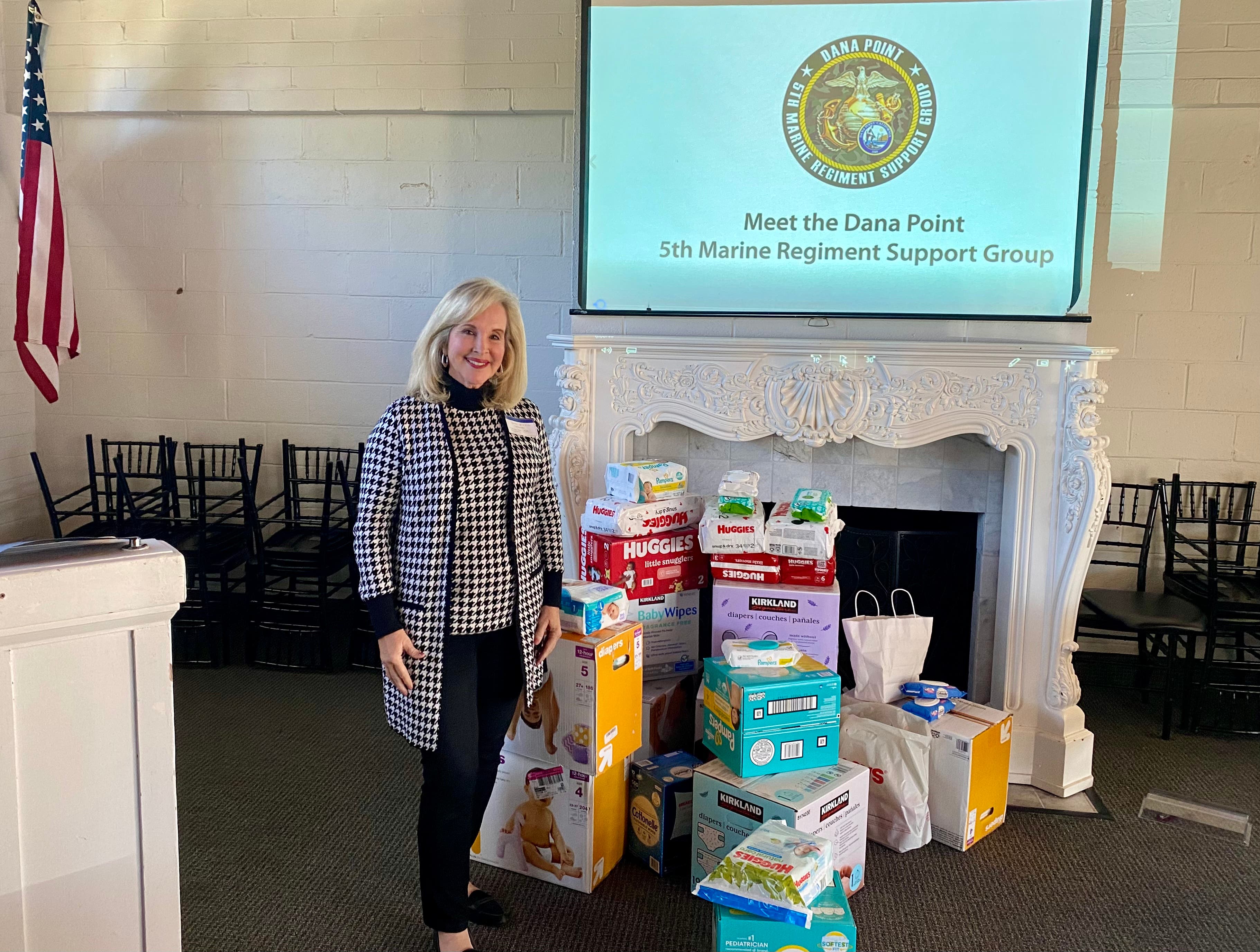 The second speaker was Terry Rifkin, President of the Dana Point 5th Marine Regiment Support Group. Ms. Rifkin is well known in the Dana Point community and to DPWC members for her accomplished leadership of this vital service organization. She made an engaging presentation on the many roles of the non-profit Group which supports not only marines, but their spouses and families. DPWC Co-President, Betty Hill presented a donation of $500 to the 5th Marines Group, in addition to an impressive pile of donated diapers and baby wipes - two of the most expensive items in the budgets of young marine families at Camp Pendleton.