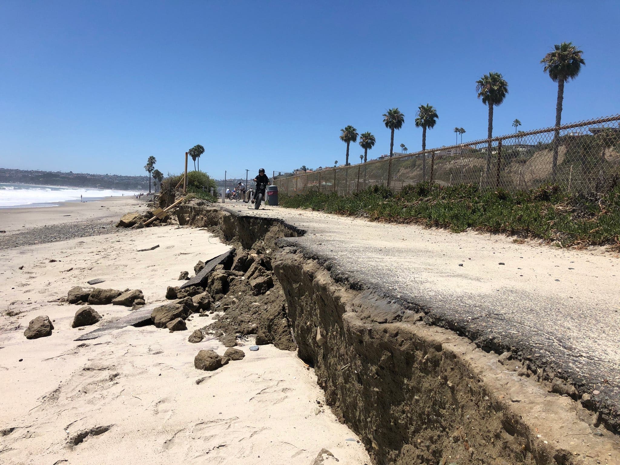 OC Parks clearly has a huge task ahead of it. Crews were already on scene Sunday morning shoveling sand from the path, scraping the parking lot, and thankfully, using heavy machinery at low tide to push sand to shore up the threatened path. According to Parks officials, they’ll have to remove damaged infrastructure first. That will likely include the old wooden seawall and a second concrete wall along the water’s edge. Chunks of both were torn away by the surf, seriously damaging the infrastructure and creating a safety hazard in front of the former basketball court.