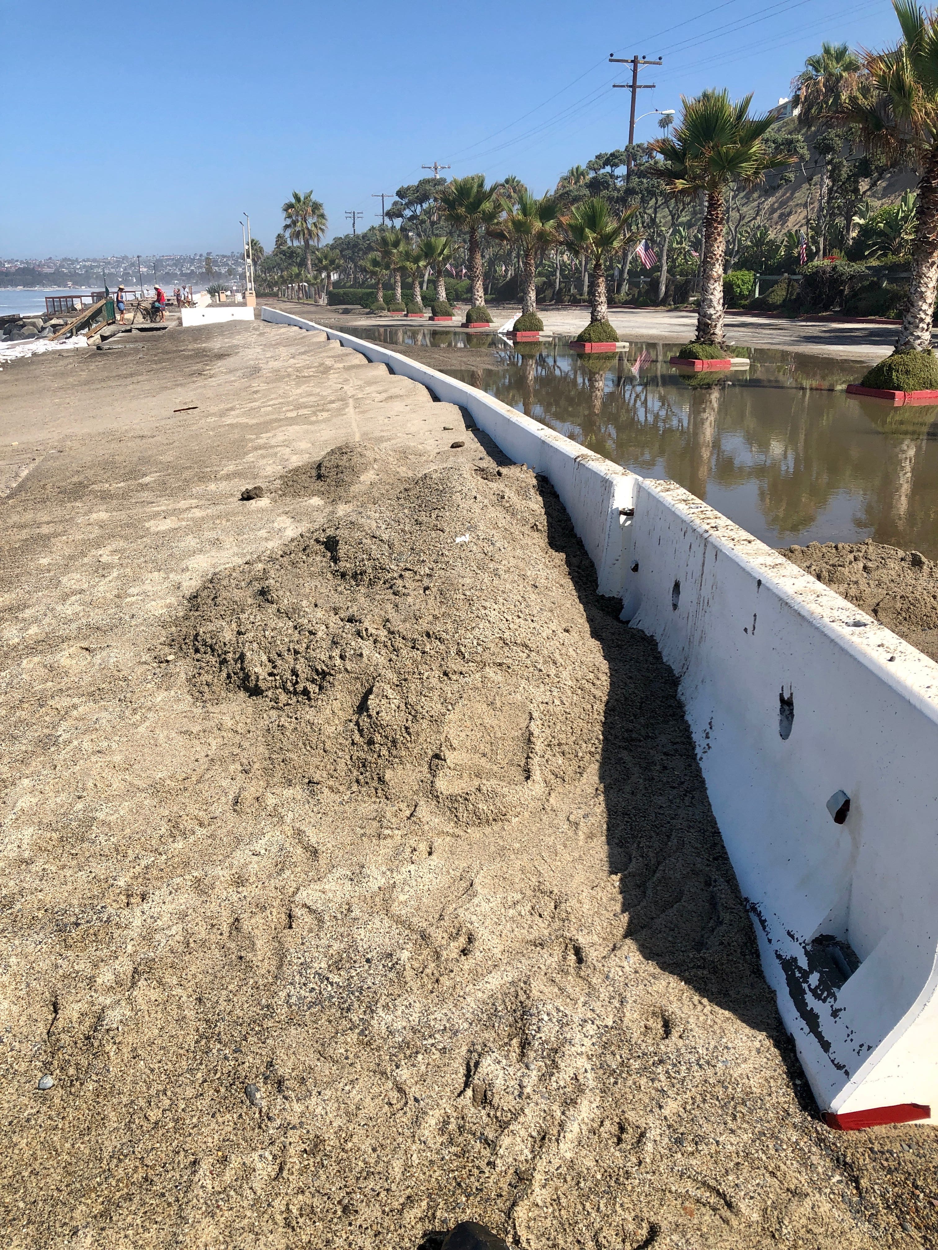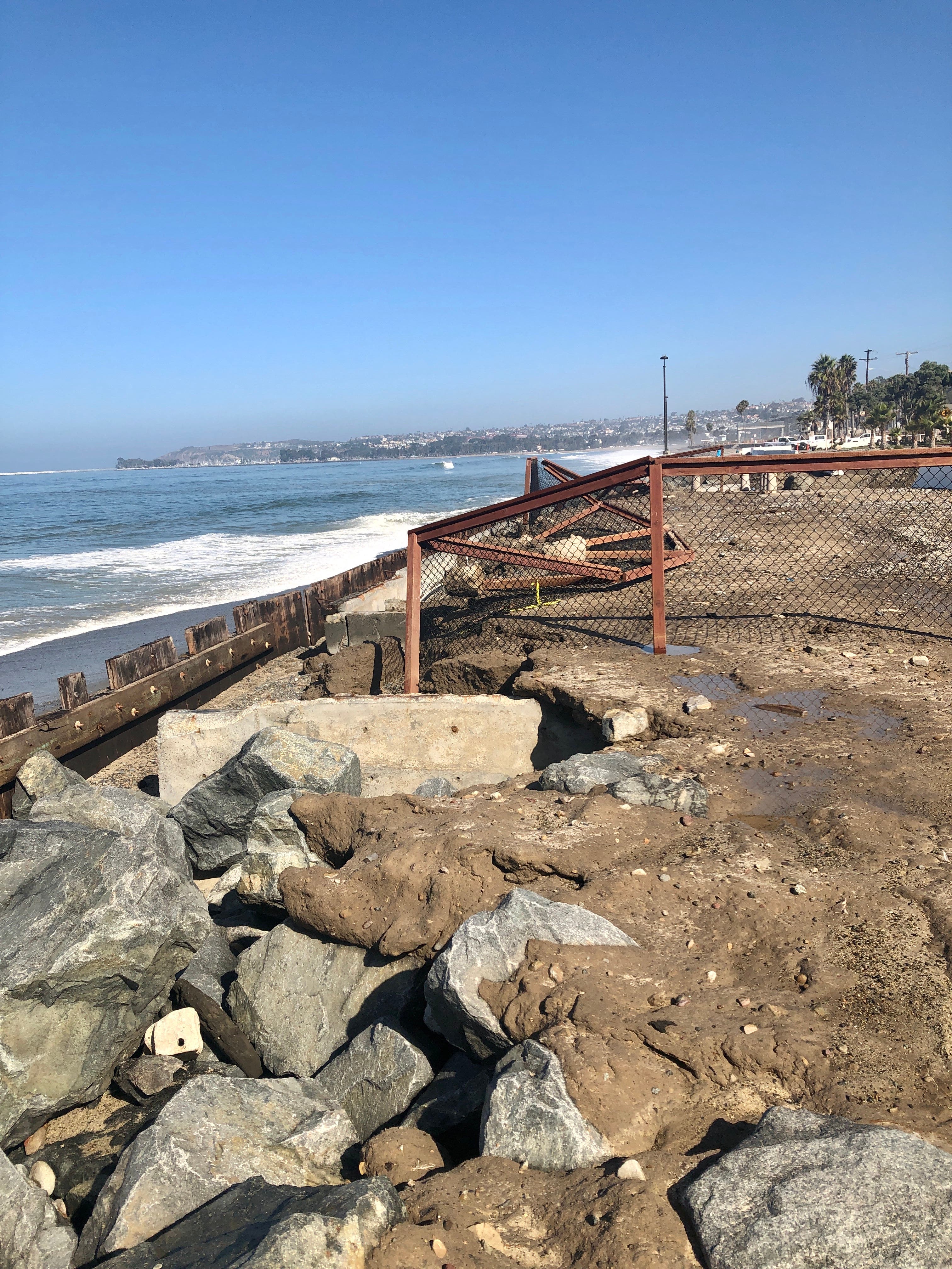 There was one bright spot at the scene of destruction. It became abundantly clear that the k-rails functioned well to keep most of the sand on the ocean side of the parking lot. Thick deposits of sand had created an “insta-beach” on the water side of the rails, even though they were too close to shore to fully protect the parking lot. One option under consideration is to sacrifice parking, unfortunately, and move the concrete structures back to create a wider natural beach that might stay in place. County officials are preparing an emergency plan to submit to the CCC to save whatever they can.