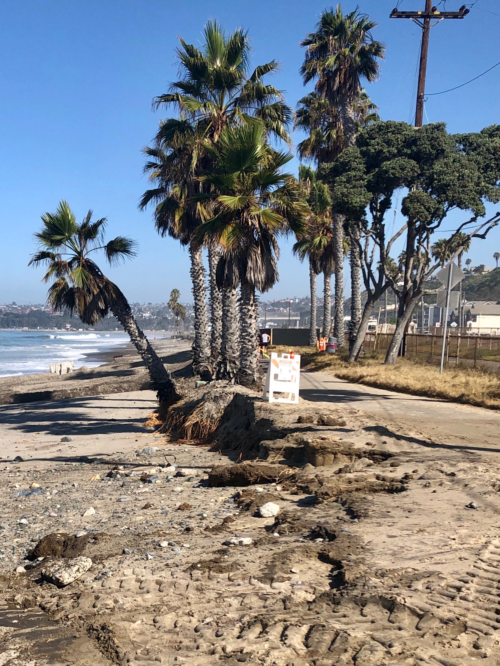 Capistrano Beach residents were alarmed and saddened this weekend to see more destruction at their beloved little namesake beach. In the past few years, they’ve become used to regular sand and cobble incursion in the parking lot, chunks of sidewalk being undermined, and palm trees falling into the surf. Almost two years ago, a beloved boardwalk dramatically collapsed into the ocean, necessitating the removal of a basketball court, restrooms and other infrastructure.