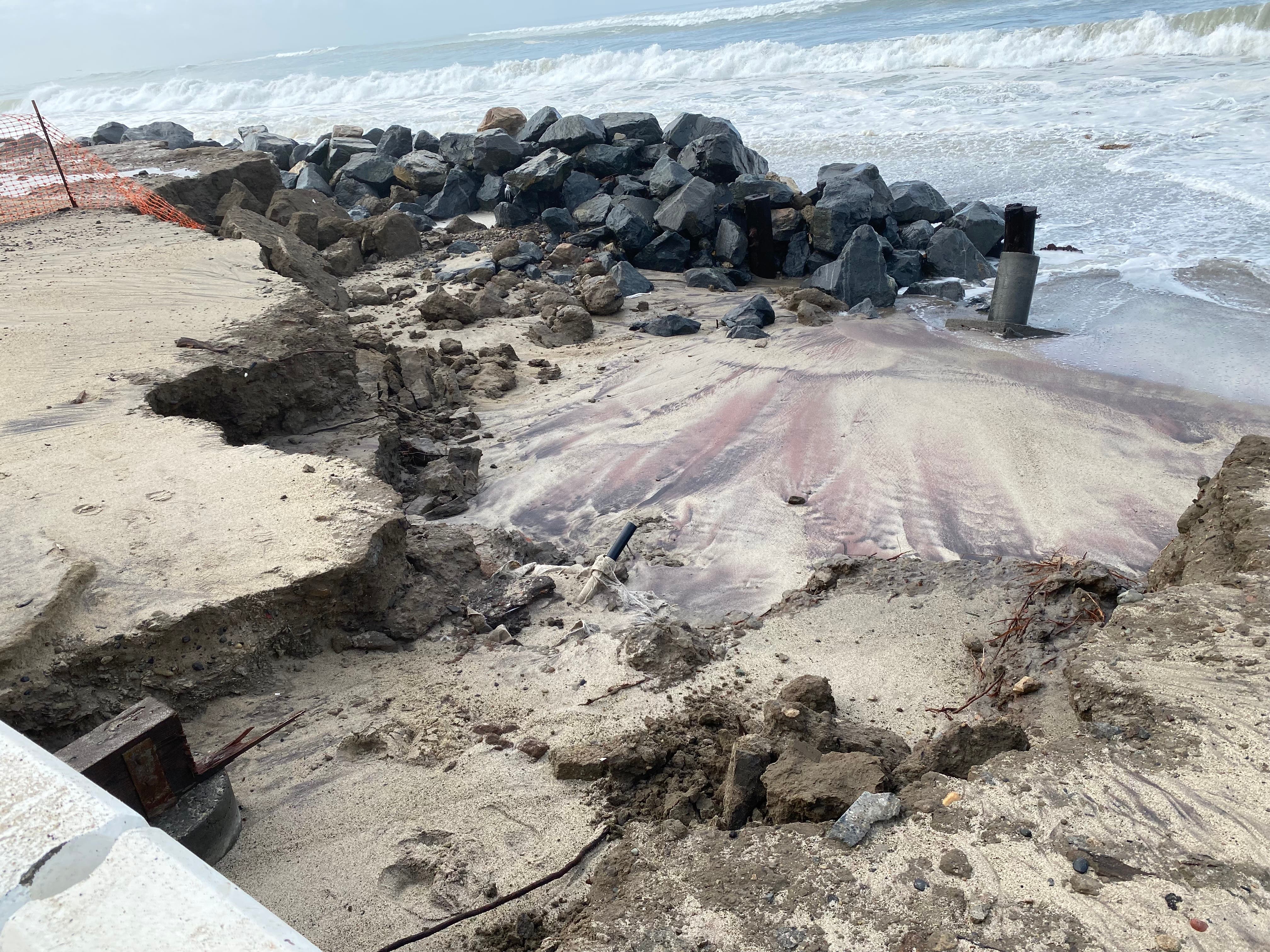 More chunks of pavement at the south end of the park had crumbled and collapsed, and three large holes (which are scheduled to be protected by realigned rip rap boulders and large sand cubes starting this month) widened further.