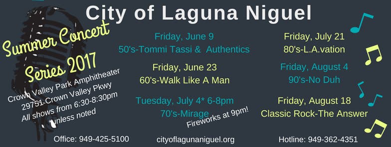 "Our Dance Through the Decades continues with the 60's as we enjoy music from Walk Like A Man Tribute, (A tribute to Frankie Valli & Music of a Golden Era)," the City of Laguna Niguel Parks and Recreation spokesperson said. "Food and dessert will be available for purchase from Soho Taco Gourmet Taco Catering, THE CUT, and Kona Ice."