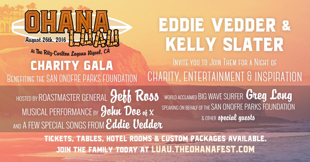 Friday night, August 26, will see this exclusive gala affair California style at the Laguna Niguel Ritz-Carlton in Dana Point. The exclusive Ohana Luau with private performances by Eddie Vedder, and hosted by "The Roast Master" himself, comedian Jeff Ross with a select group of surprise appearances. Dinner, music, entertainment and fundraising will be the order of the Ohana Luau in an intimate family experience.