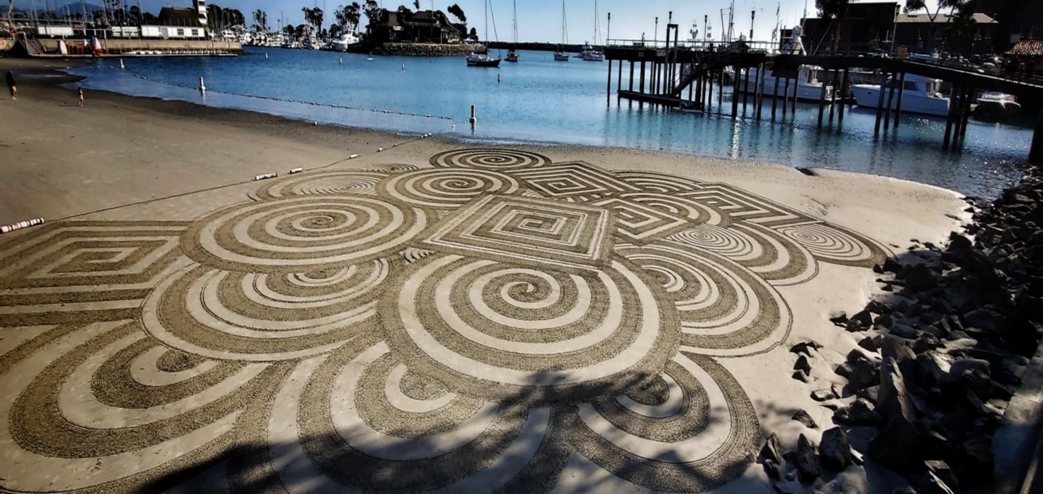 Local resident Zalan Szabo has been taking to the shores of Southern California to rake sand for some years now — his massive, ephemeral work spotted on the shores of Dana Point's Baby Beach, Salt Creek and more.