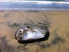 A few spectators gathered round to make speculations on the species of this flat fish that appears to be mostly head and no tail. The part on top of the sand was roughly two feet long.