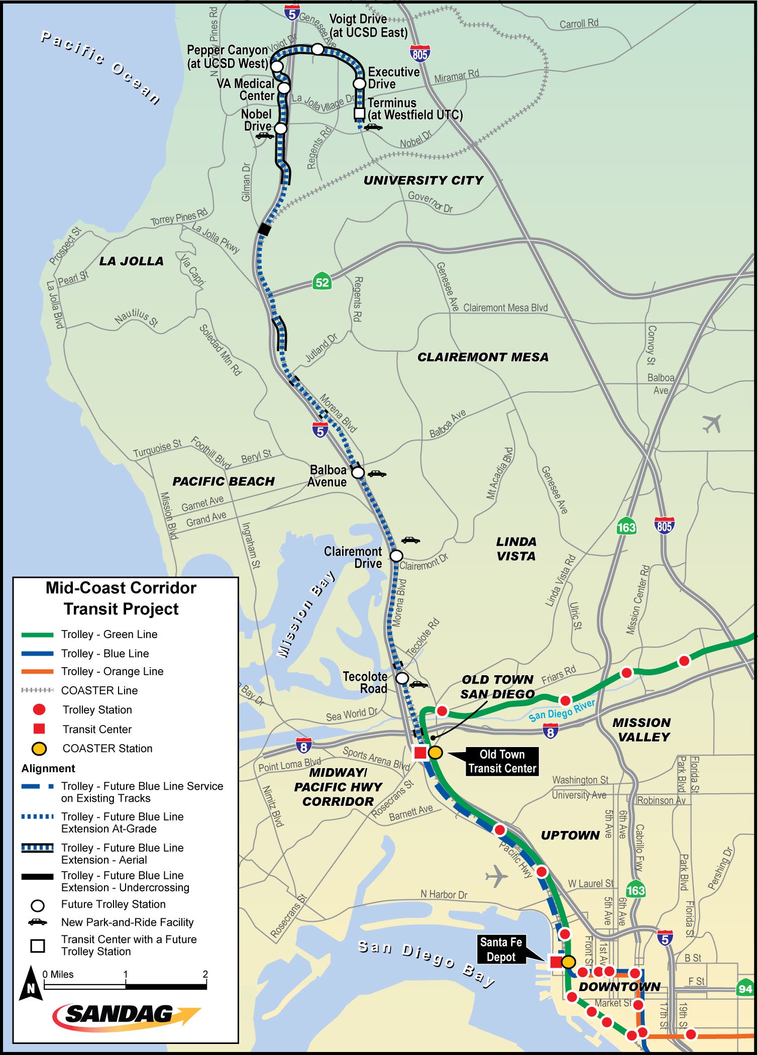 It will be the largest public transit project in the history of the region. The 11-mile Mid-Coast Trolley Extension will include nine new stations serving Mission Beach, Pacific Beach, the VA Medical Center, UC San Diego, and the dense business and commercial districts along Genesee Avenue.
