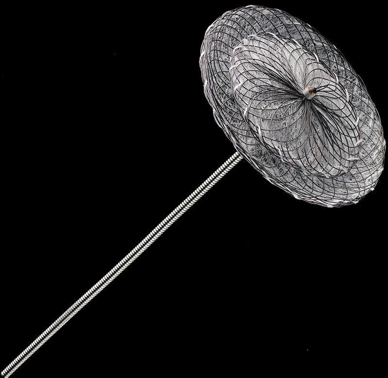 Once the tip of the catheter is positioned in the hole, a pair of mesh and polyester fabric discs are unfolded and clasped together, closing the opening.