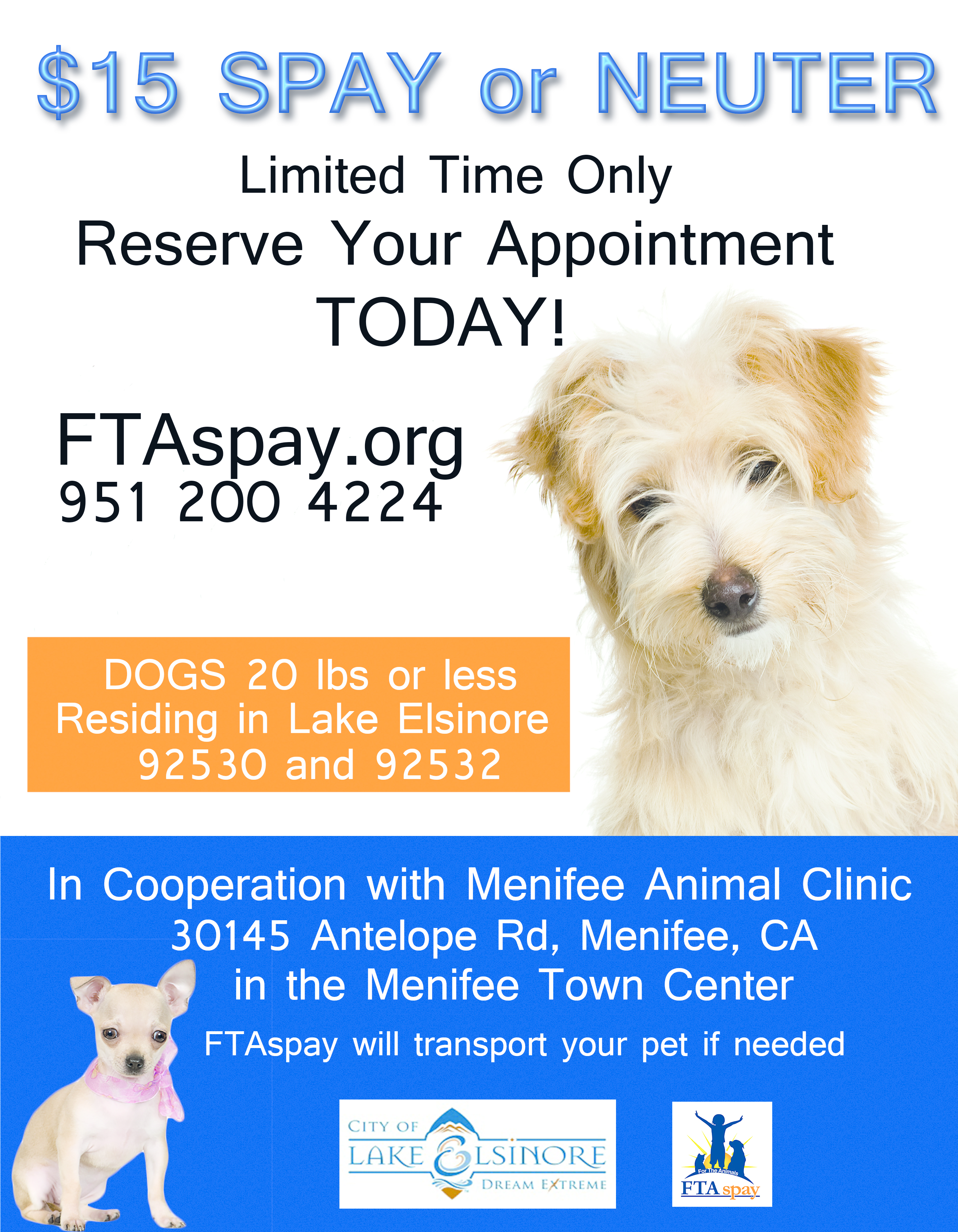 $15 Low Cost Spay Neuter for dogs 20lbs and under, Lake Elsinore City Residents only
