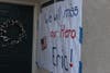 A sign hung near the front door of the residence. It said, "We will miss your our Hero Eric!" It was painted in red, white and blue.