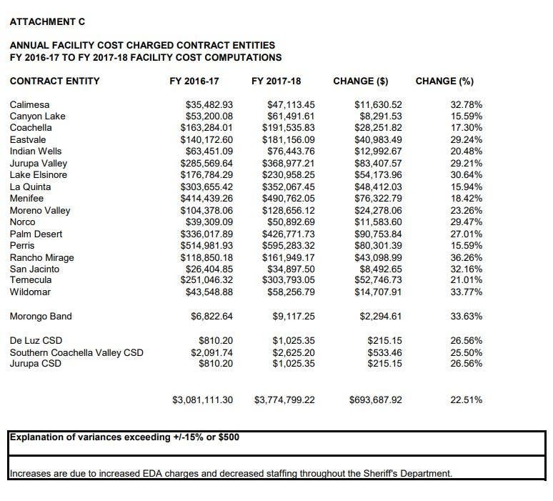 In 2015, a 7 percent hike prompted an outcry from elected and non- elected officials from Indian Wells, Lake Elsinore, Moreno Valley, Palm Desert and Temecula, who challenged the justification for such a significant upward adjustment. They protested that law enforcement expenses were draining their budgets and should be capped.