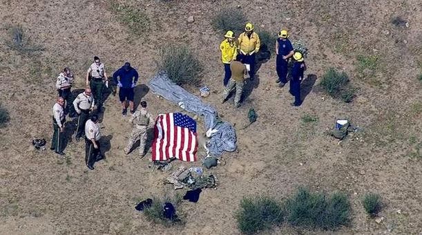 Aerial images from the scene showed the sailor’s parachute lying on the ground next to his body, which was draped with an American flag. Image courtesy KABC-TV.