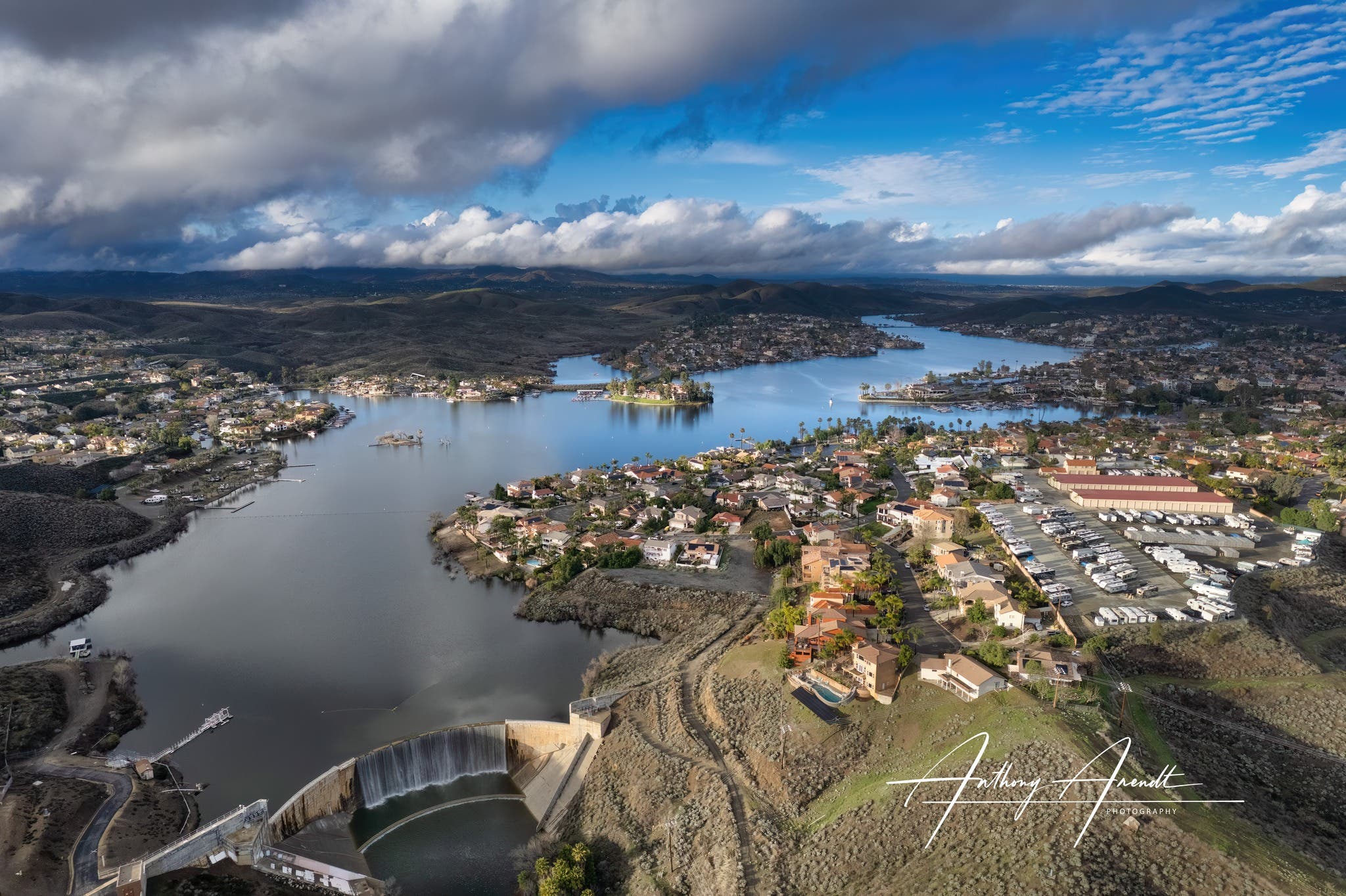 CANYON LAKE, CA — A crystal clear sky and a full lake are the payoff after days of rain. This view of Canyon Lake at its fullest was taken by drone photo thanks to Southwest Riverside County photographer Anthony Arendt.