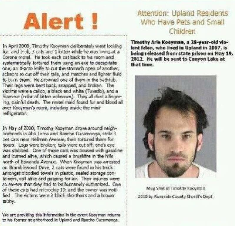 In January 2011, Kooyman was sentenced to two years, eight months behind bars for torturing and killing three cats in a Corona motel room. After serving just more than half of his sentence, the 28-year-old convicted felon is being released based on good time and other credits.