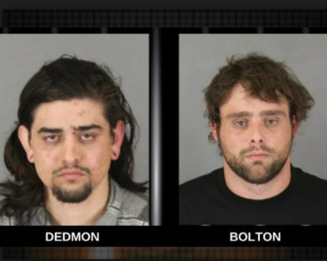 "The paint on the fence matched the paint inside Mr. Dedmon's vehicle and on both Mr. Dedmon and Mr. Bolton," the department said, adding that they were booked into the Cois Byrd Detention Center.