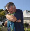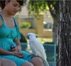 Jelly Bean, a 10-year-old female Umbrella Cockatoo, who was rescued after she was found loose in Murrieta, clung to her “foster failure” mom Cathy Cregar at the park on Sunday.