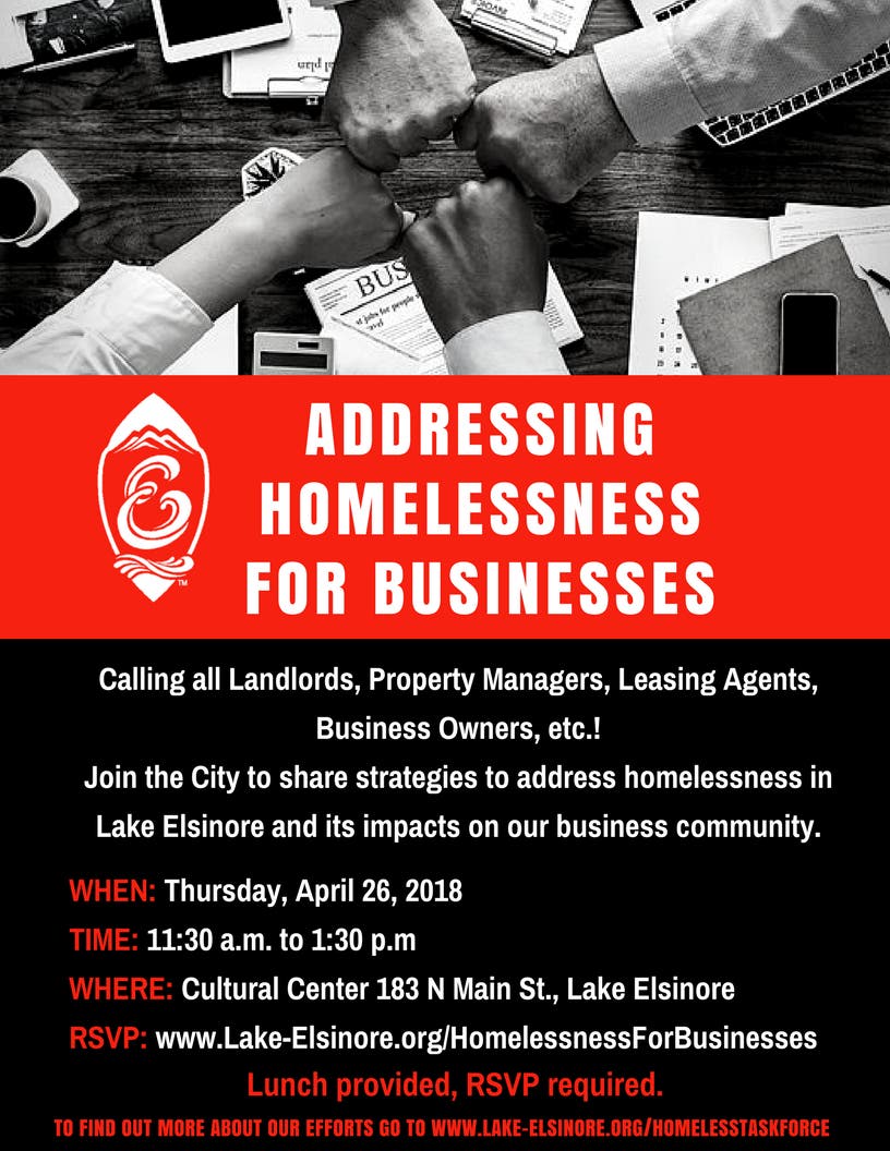 From The City of Lake Elsinore: Join the City of Lake Elsinore to share strategies to address homelessness and its impacts our local business community.
