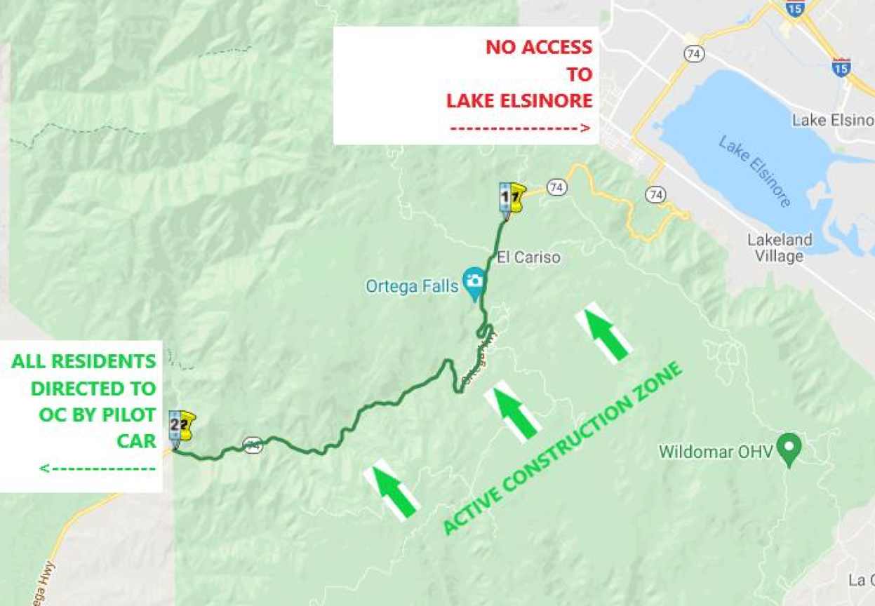 Residents on Tenaja Truck Trail or west of Tenaja Truck Trail, including the Ortega Oaks RV Park and Campground and The Candy Store, will be directed to Orange County and will not be given access to go through to Lake Elsinore during the hours of 10 p.m. to 5 a.m., according to Caltrans.