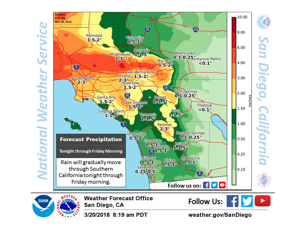 Forecasters say a flash flood watch is in effect for the Inland Empire from late Wednesday through late Thursday as up to an inch of rain may fall per hour "during periods of the most intense rainfall." The NWS expects areas near the coast to be hit with 1.5 to 2 inches of rain between now and Friday morning, while those along the coastal slopes of the San Bernardino County mountains may see between 4 to 6 inches of rain.