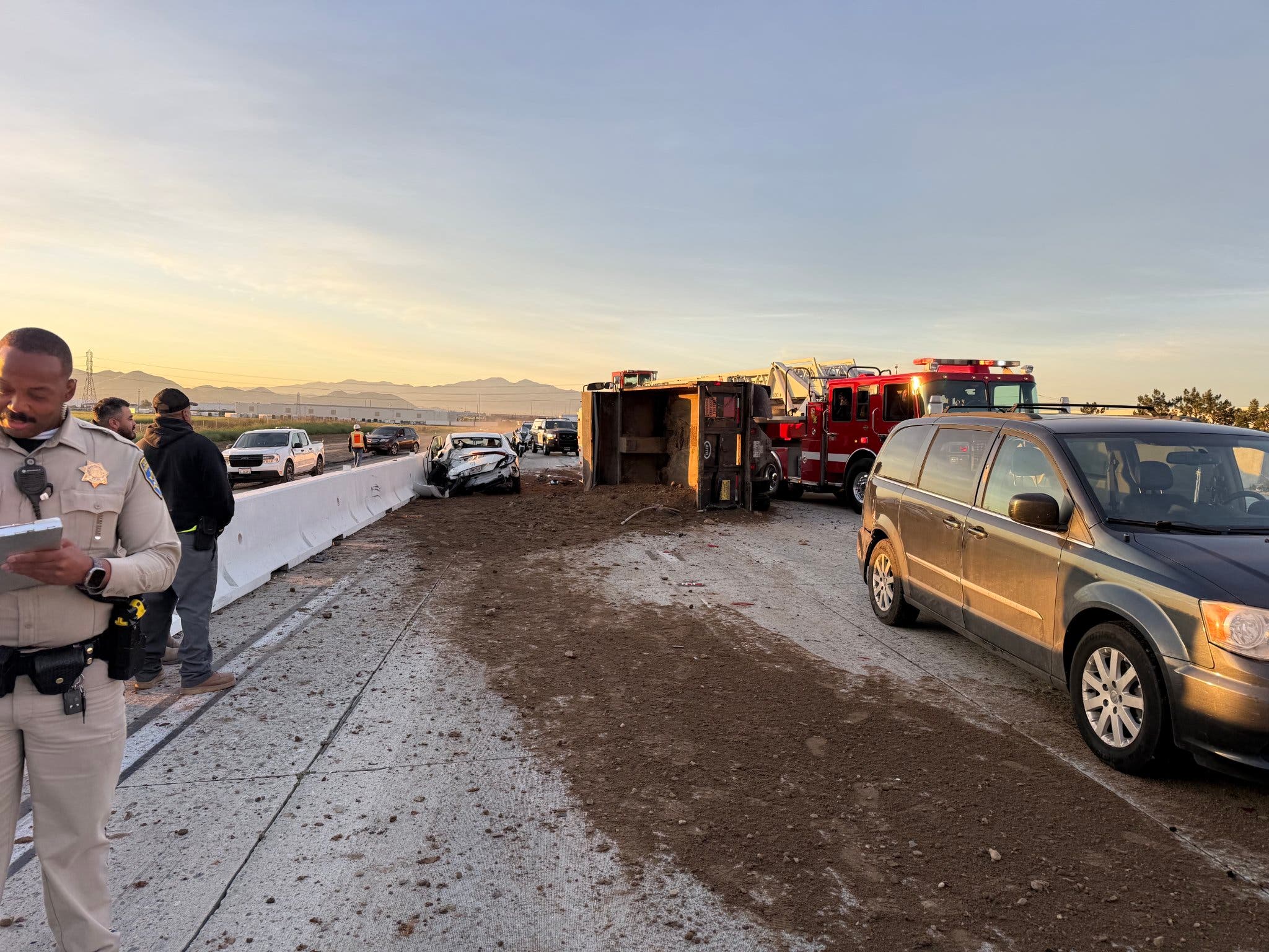 Just after 6 a.m., a full dump truck and at least one other vehicle collided, causing a chain reaction crash, according to CHP dispatch operators. As many as six vehicles were involved in follow-up crashes, according to reports from the scene. "It looks really bad," a witness said.