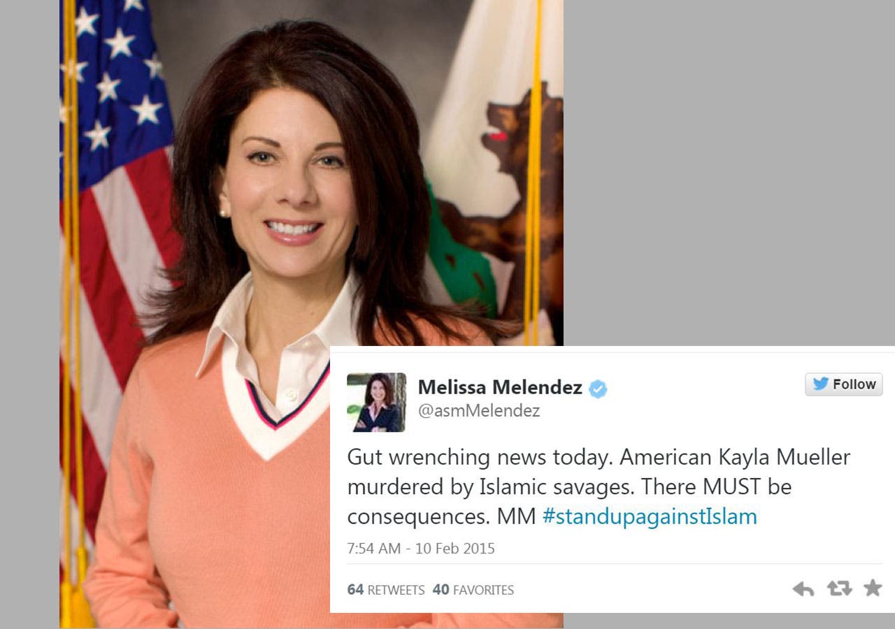 Assemblywoman Melissa Melendez, R-Lake Elsinore, was under fire Friday from a Los Angeles-based Muslim advocacy group that called her use of the phrase “Islamic savages” in a tweet “hate rhetoric.”