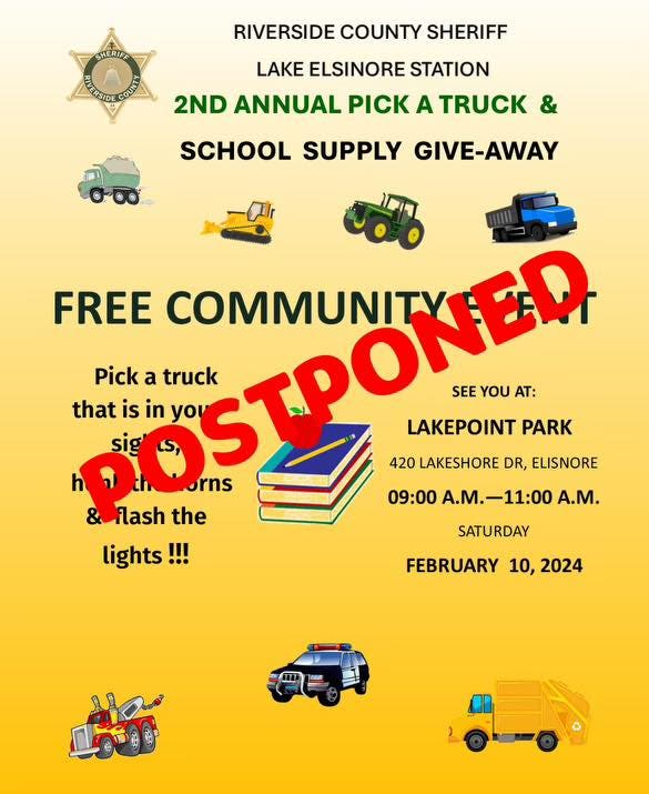 If you were planning on attending Saturday's Lakepoint Park event in Lake Elsinore, be advised: The 'Pick a Truck' event has been postponed.