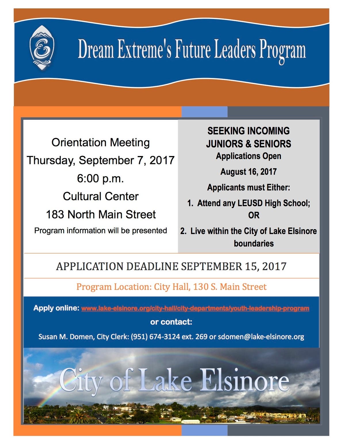 From The City of Lake Elsinore: Dream Extreme's Future Leaders Program Orientation Meeting, Thursday September 7, 2017 @ 6:00pm. Hosted at the Lake Elsinore Cultural Center, 183 N. Main Street Seeking incoming Juniors and Seniors, Applications now open. Deadline to apply is 9-15-17. Come to the meeting to find out more information.