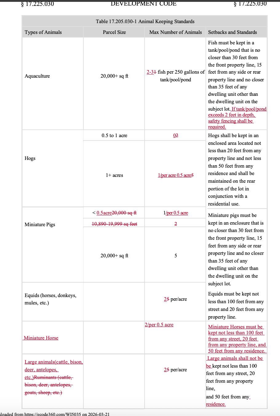 The proposed changes separate out ruminants (hooved animals) from large animals. These would be referred to as domestic animals, including goats, sheep, alpacas and llamas, allowed at no more than 3 per acre, 100 feet from any street, 20 feet from property lines, and 50 feet from residences, according to the documents.