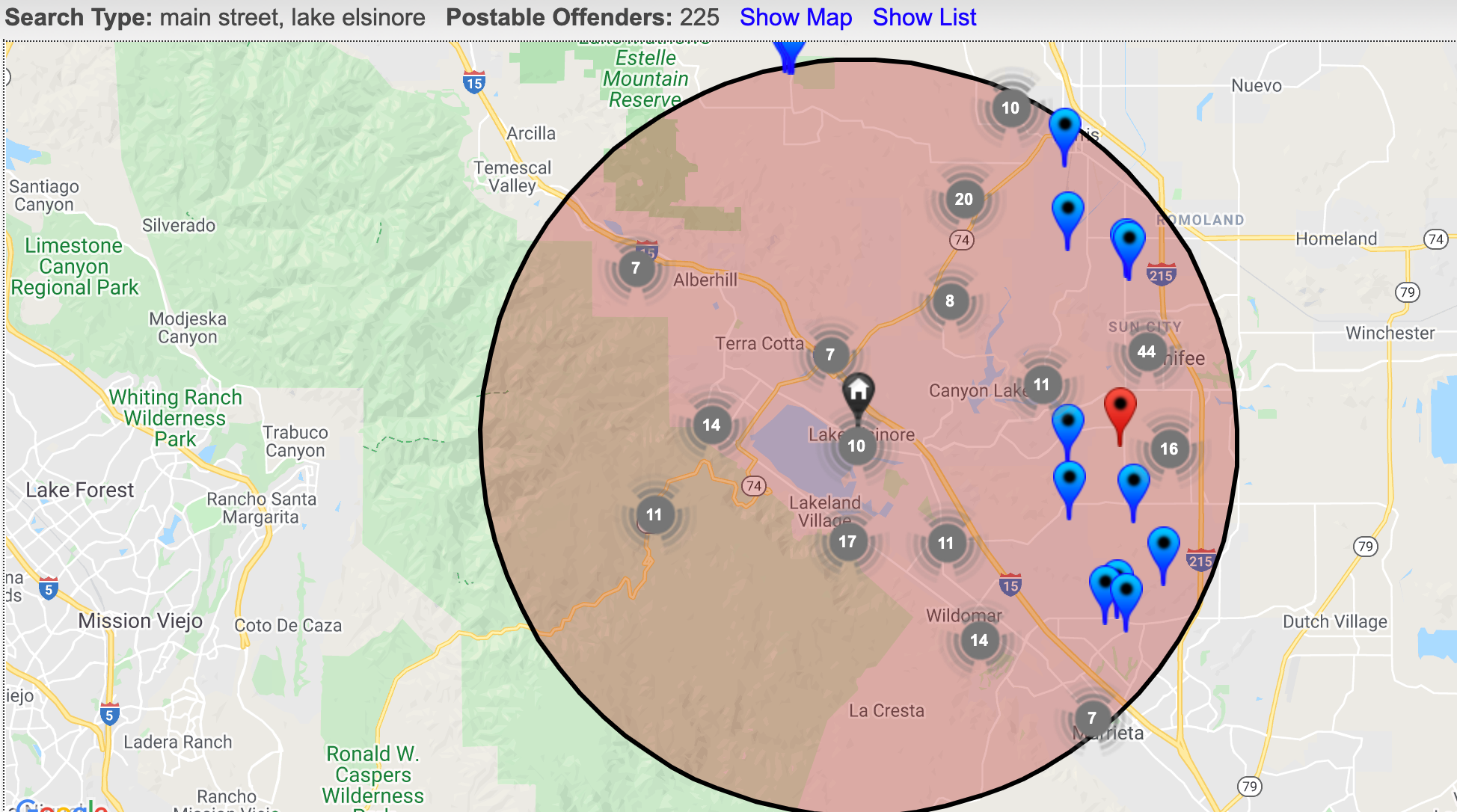 Here's how to find information on these offenders. First, visit the Megan's Law home page. On the right-hand side of the page, go to California Sex Offender Map Search and type in Lake Elsinore, CA and choose 10-mile radius on the dropdown menu (this will give you all 225 offenders within a 10-mile radius of the city). NOTE: After entering your selection, you will be prompted to first read and acknowledge a disclaimer.